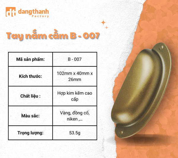 Tay nắm cầm B-007không chỉ là một phụ kiện thông thường, mà còn là một điểm nhấn tinh tế, thể hiện gu thẩm mỹ của gia chủ. Với thiết kế sang trọng và chất liệu bền bỉ, sản phẩm này sẽ mang đến sự khác biệt cho không gian nội thất của bạn.